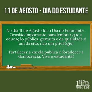 12 de agosto de 2025 A ADUR parabeniza todos os estudantes pelo seu dia, celebrado em 11 de agosto. O Dia do Estudante é uma lembrança para reconhecermos, enquanto sociedade, o papel fundamental daqueles que ocupam as salas de aula, as bibliotecas e as ruas em defesa de uma educação pública, gratuita, laica e de qualidade. A trajetória do movimento estudantil brasileiro é marcada por resistência, mobilização e protagonismo nas lutas sociais. Os estudantes estiveram na linha de frente contra a ditadura militar, enfrentando a repressão e lutando bravamente pela redemocratização do país. Também foram protagonistas no movimento que culminou com o impeachment de Fernando Collor, demonstrando novamente sua força e organização em defesa da ética e da democracia. A ADUR reafirma seu compromisso com essa luta histórica e com a construção de um ambiente universitário plural, inclusivo e crítico. Relembrar esta data também é um chamado à reflexão sobre os desafios enfrentados pelo ensino superior público. A precarização das universidades federais, o desmonte de políticas educacionais e o avanço de pautas autoritárias ameaçam o direito à educação. É essencial que docentes, estudantes e técnico-administrativos estejam unidos em defesa da universidade pública. Que este dia reforce ainda mais a luta coletiva por uma sociedade mais justa e democrática!