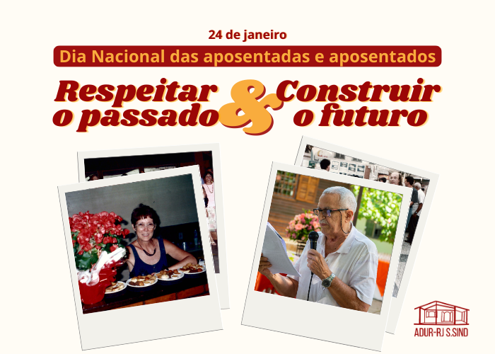 24 de janeiroDia Nacional das Aposentadas e AposentadosDiretoria da ADUR tem atuado ativamente para garantir direitos relacionados à carreira docentereenquadramento de aposentadoshomenageia as trabalhadoras e trabalhadoresreforça a defesa deste direito adquirido