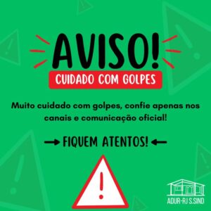 12 dezembro de 2024 Comunicação da ADUR A Adur foi informada sobre uma tentativa de golpe via WhatsApp pelo número (21) 9970-74118, utilizando o nome de uma associada e envolvendo o nome do advogado do sindicato, Dr. Carlos Alberto Boechat. Nas mensagens, os golpistas se apresentam em nome do escritório e mencionam um suposto processo judicial em fase de liberação. A recomendação é que as pessoas contatadas bloqueiem imediatamente o perfil utilizado pelos criminosos. A ADUR também orienta os docentes a não realizarem qualquer transação financeira. A entidade sindical reforça que são utilizados apenas os seguintes números: (21) 99919-7788 ou (21) 99158-4389.