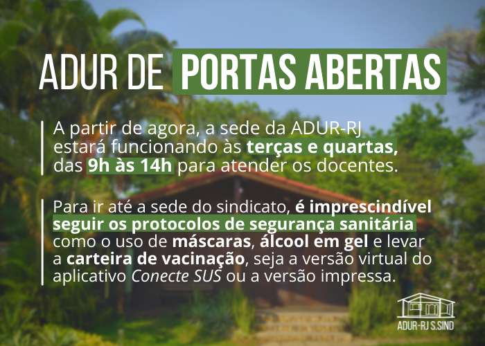 ✅👩🏽🏫👨🏻🏫 A partir de agora, a sede da ADUR-RJ estará funcionando às terças e quartas, das 9h às 14h, para atender os docentes associados.