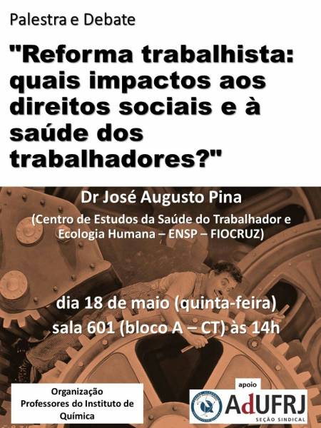 No dia 18 de maio, os professores do Instituto de Química da UFRJ, em parceria com a ADUFRJ, irão promover o debate "Reforma trabalhista: quais impactos aos direitos e à saúde dos trabalhadores?" A atividade contará com a participação do professor e pesquisador da FioCruz, especialista em saúde do trabalhador, José Augusto Pina. O evento acontecerá às 14h, na sala 601, bloco A do Centro de Tecnologia da UFRJ.