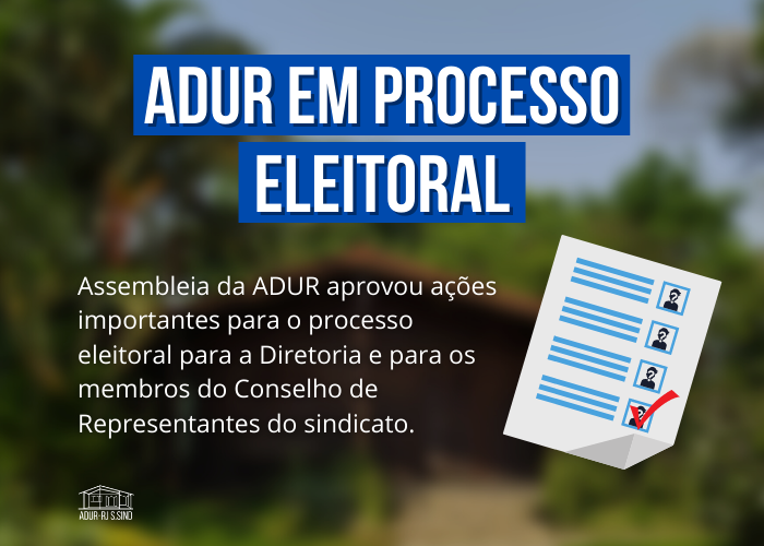 A última Assembleia da ADUR, ocorrida no dia 20 de agosto, aprovou ações importantes para o processo eleitoral para a Diretoria e para os membros do Conselho de Representantes do sindicato. Foi formada a Comissão que irá organizar o pleito e foram aprovados o regimento da eleição, o calendário eleitoral e a empresa que irá viabilizar a eleição no formato virtual.