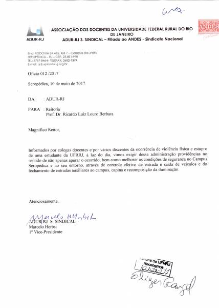 ADUR exige mais segurança para o campus SeropédicaADUR11 de mai. de 20171 min de leituraNesta semana, a UFRRJ foi alarmada por uma pauta antiga: falta de segurança no campus Seropédica. Após mais um caso de estupro, a Associação de Docentes da UFRRJ enviou ofício à reitoria, em que exige mais segurança para o campus e seu entorno.