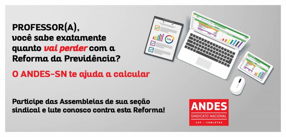 O ANDES Sindicato Nacional está lançando uma nova ferramenta para que professoras e professores de todo o país possam ter ciência de alguns dos impactos com a aprovação da nova Previdência Social. Além do desmonte de vários direitos e da defasagem nas remunerações, os docentes sentirão ainda mais a usurpação dos salários com o novo regime previdenciário. Um desses impactos é a incidência sobre a alíquota de desconto previdenciário, que passa dos 11% para 14,5% a 22% para aqueles que recebem acima do teto do INSS. Na ferramenta disponibilizada pelo ANDES-SN será possível fazer um comparativo de quanto os docentes pagavam com o regime previdenciário anterior e quanto vão pagar no novo regime, além das perdas mensais e anuais. Será possível verificar ainda qual o valor do desconto previdenciário que incidirá sobre a remuneração. Clique aqui e acesse a Calculadora