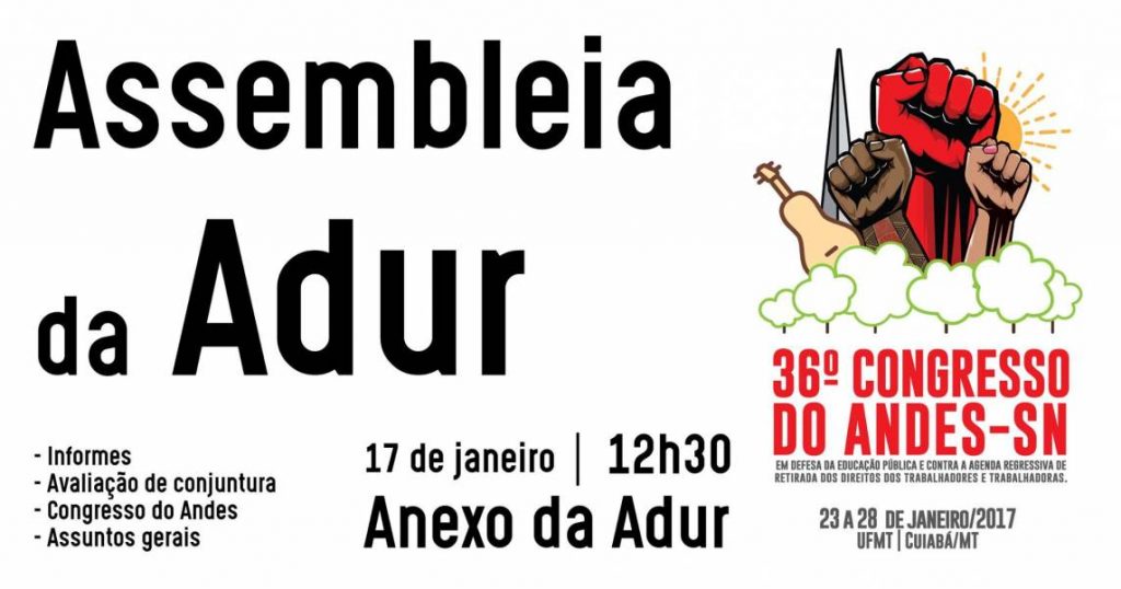 Assembleia da AdurADUR14 de jan. de 20171 min de leituraA primeira Assembleia da Adur de 2017 será na próxima terça-feira, dia 17 de janeiro, no Anexo da Adur. A partir de 12h30, os professores irão avaliar a conjuntura e discutir sobre o Congresso do Andes. Participe!