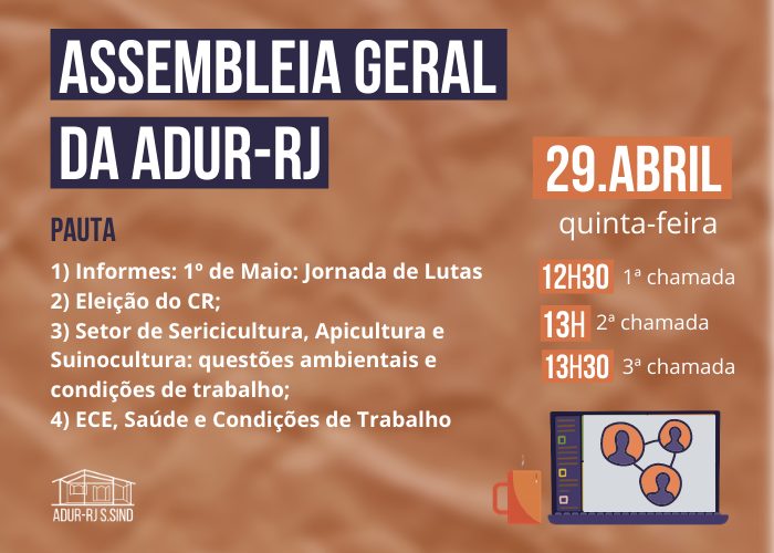 📢 ATENÇÃO, DOCENTES! 📢 🗓️ Nesta quinta-feira, dia 29 de abril, acontecerá a Assembleia Geral da ADUR-RJ. A primeira chamada será feita às 12h30min, a segunda chamada às 13h e a terceira às 13h30min. A pauta da reunião será: 1) Informes: 1º de Maio: Jornada de Lutas; 2) Eleição do CR; 3) Setor de Sericicultura, Apicultura e Suinocultura: questões ambientais e condições de trabalho; 4) ECE, Saúde e Condições de Trabalho. 👉 O encontro acontecerá através da plataforma Zoom e será aberto para participação de todos os docentes associados. 📲💻 Acesse através do link: https://bit.ly/3dYPnedPARTICIPE! 💪