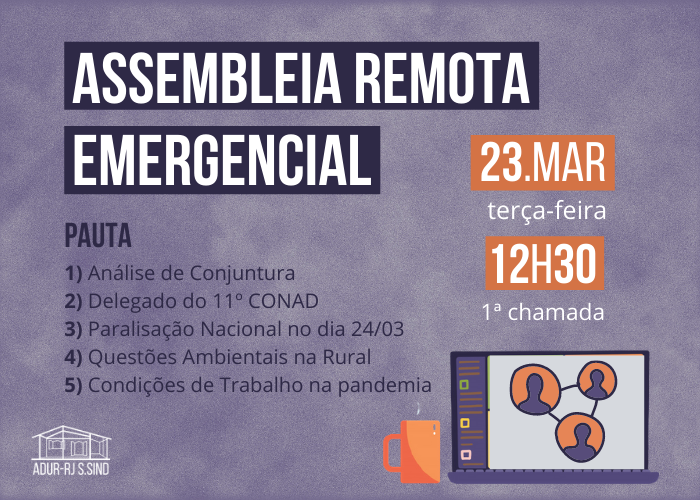 👉 Na próxima terça-feira, dia 23 de março, acontecerá uma Assembleia Remota Emergencial da ADUR-RJ. A primeira chamada será feita às 12h30min.