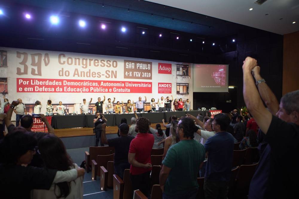 Dez dias após o aniversário de 466 anos da cidade mais populosa da América Latina, São Paulo recebeu o 39º CONGRESSO DO ANDES-SINDICATO NACIONAL, realizado entre os dias 04 e 08 de fevereiro de 2020, com o tema “Por liberdades democráticas, autonomia universitária e em defesa da educação pública e gratuita”. Sediado pela histórica Associação dos Docentes da Universidade de São Paulo (ADUSP-Seção Sindical), o Congresso, com 86 seções sindicais, 460 delegadas/os, 178 observadoras/os e 14 convidadas/os, além de 34 diretores/as totalizando 680 participantes, sendo o de maior presença de seções sindicais e de delegadas/os da história do ANDES-SN. Os participantes estavam nutridos pela certeza da construção da greve da categoria em uma das mais importantes batalhas contra a destruição dos institutos federais, CEFET e universidades por uma extrema-direita que, recentemente, na fala do Ministro da Economia, qualificou os servidores e servidoras públicas de “parasitas”.