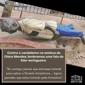 03 de julho de 2022 Imprensa da ADUR-RJ A ADUR-RJ repudia a depredação da estátua do líder seringueiro, Chico Mendes, que fica na Praça dos Povos da Floresta, em Rio Branco (Acre). Para a entidade, além de ser um patrimônio público, a derrubada da estátua é um desrespeito à família de Chico Mendes, aos seus companheiros, a todo o seu legado sócio ambiental. "A história de Chico deve ser defendida por todos aqueles que lutam para manter viva a preservação da Amazônia”, destaca a direção da entidade de docentes da UFRRJ Chico Mendes, Presente!