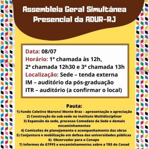 04 de julho de 2022 Imprensa da ADUR-RJ 📢ATENÇÃO DOCENTES! 🗓No dia 08 de julho (sexta-feira) a ADUR-RJ realizará a primeira Assembleia Geral Presencial Simultânea na Sede, IM e Três Rios, conforme aprovado na AG realizada no dia 15 de junho de 2022. Para realizar esse desafio o Conselho de Representantes aprovou a compra de equipamentos e apoio técnico. É importante frisar que a simultaneidade exige presença e não será transmitida. 📝Pauta 1) Fundo Coletivo Maronci Monte Braz – apresentação e apreciação 2) Construção da sub-sede no Instituto Multidisciplinar 3) Expansão da sede, processo Comodato da Sede e demais encaminhamentos – informe 4) Comissões de planejamento e acompanhamento das obras 5) Conjuntura e mobilização em defesa das universidades públicas 6) Observador para o Conape 7) Informes do GTPFS e encaminhamentos sobre a TR5 do Conad ⏰ Horário 1ª chamada as 12h 2ª chamada 12h30 3ª chamada 13h 📌Localização Sede – tenda externa IM – auditório da pós-graduação ITR – auditório (a confirmar o local) 🙋♂️🙋♀️🙋🏾♀️🙋🏾♂️Participe !