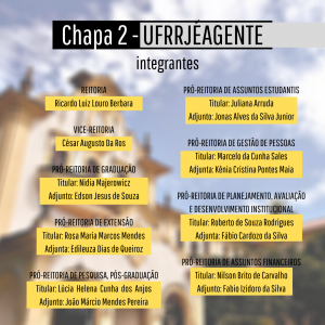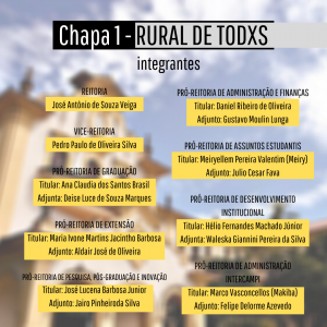A Comissão Organizadora da Consulta Pública para a próxima Reitoria da UFRRJ homologou duas chapas concorrentes: Chapa 1 - RURAL DE TODXS, que tem como candidato à reitor o professor José Antônio de Souza Veiga; e a Chapa 2 - UFRRJÉAGENTE, com o professor Ricardo Luiz Louro Berbara como candidato ao cargo de reitor. Confira os nomes de todos os integrantes das duas chapas.