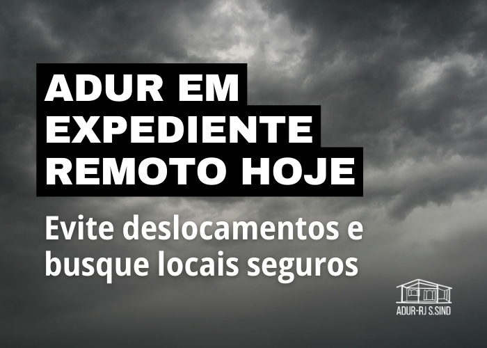 A diretoria da ADUR informa que o atendimento presencial no sindicato será suspenso nesta sexta-feira (22/3) devido aos alertas de fortes chuvas em todo o estado do Rio de Janeiro e recomendação das autoridades para evitar deslocamentos.