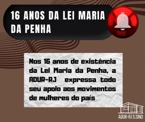 07 de agosto de 2022 Imprensa da ADUR-RJ 🙍♀️🙍🏽♀️Nos 16 anos de existência da Lei Maria da Penha, a ADUR-RJ expressa todo seu apoio aos movimentos de mulheres do país que ajudaram na criação desta lei que é considerada um divisor de águas na abordagem jurídica brasileira na luta contra a violência baseada no gênero. 📌É importante ressaltar que, hoje, a violência contra as mulheres representa uma das principais formas de violação dos Direitos Humanos. Pois, além de contribuir para a desigualdade de gênero, afeta diretamente direitos considerados fundamentais, como o direito à vida, o direito à saúde e à integridade física. 📚De acordo com o Anuário de Segurança Pública de 2021, 1 em cada 4 mulheres de 16 anos ou mais foi vítima de algum tipo de violência nos últimos 12 meses no Brasil, isso corresponde a 17 milhões de mulheres. Quase a metade, 48%, foram agredidas e violentadas dentro de suas próprias casas e 32% não procuraram apoio em qualquer tipo de instituição. Só 12% das mulheres agredidas denunciaram a violência na Delegacia da Mulher e apenas 7% acionaram o 190. 📢O sindicato reitera que em caso de violência, peça ajuda ou denuncie: ☎️197 (Disque Denúncia da Polícia Civil) 180 (Central de Atendimento à Mulher) 190 (Disque Denúncia da Polícia Militar – em casos de emergência)
