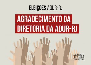 A Diretoria da ADUR-RJ agradece a todas e todos os 585 docentes filiados que participaram da eleição da entidade, bem como as chapas 1, encabeçada pela professora Tatiana Cotta, e a Chapa 2, pela professora Elisa Guaraná.