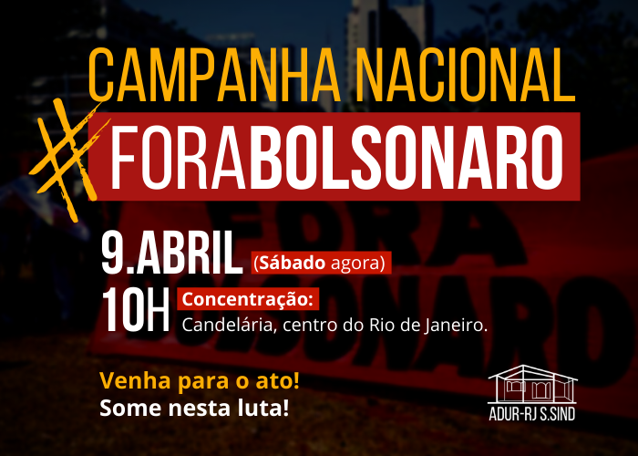 Participe da Campanha Nacional pelo #ForaBolsonaro nas ruas, dia 9 de abril!ADUR8 de abr. de 20221 min de leitura 🔺Não esqueça de:😷 Levar máscara 💦 Álcool em gel🚶♀️🚶🏽♀️🚶🏾♂️Manter distância durante ato