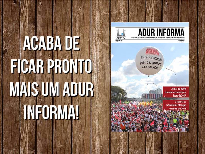 Acaba de ficar pronto mais um ADUR Informa! A edição 171 destaca a retrospectiva das lutas em 2017 e também apresenta textos sobre o Congresso do ANDES; sobre a intervenção federal no Rio e as implicações da medida na reforma da Previdência, entre outros. Leia a versão on-line neste link ou retire a edição impressa nos institutos e na sede da ADUR.