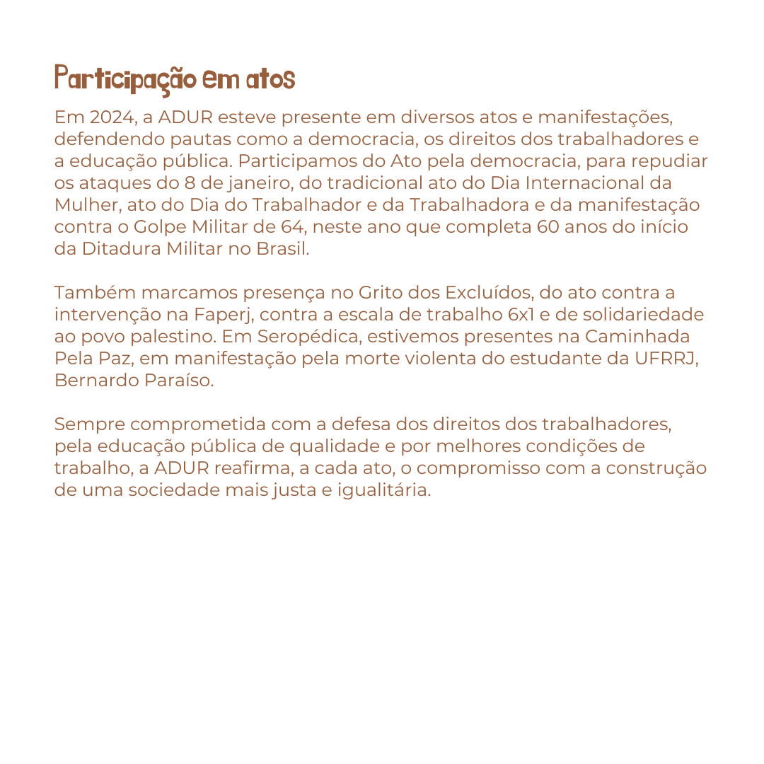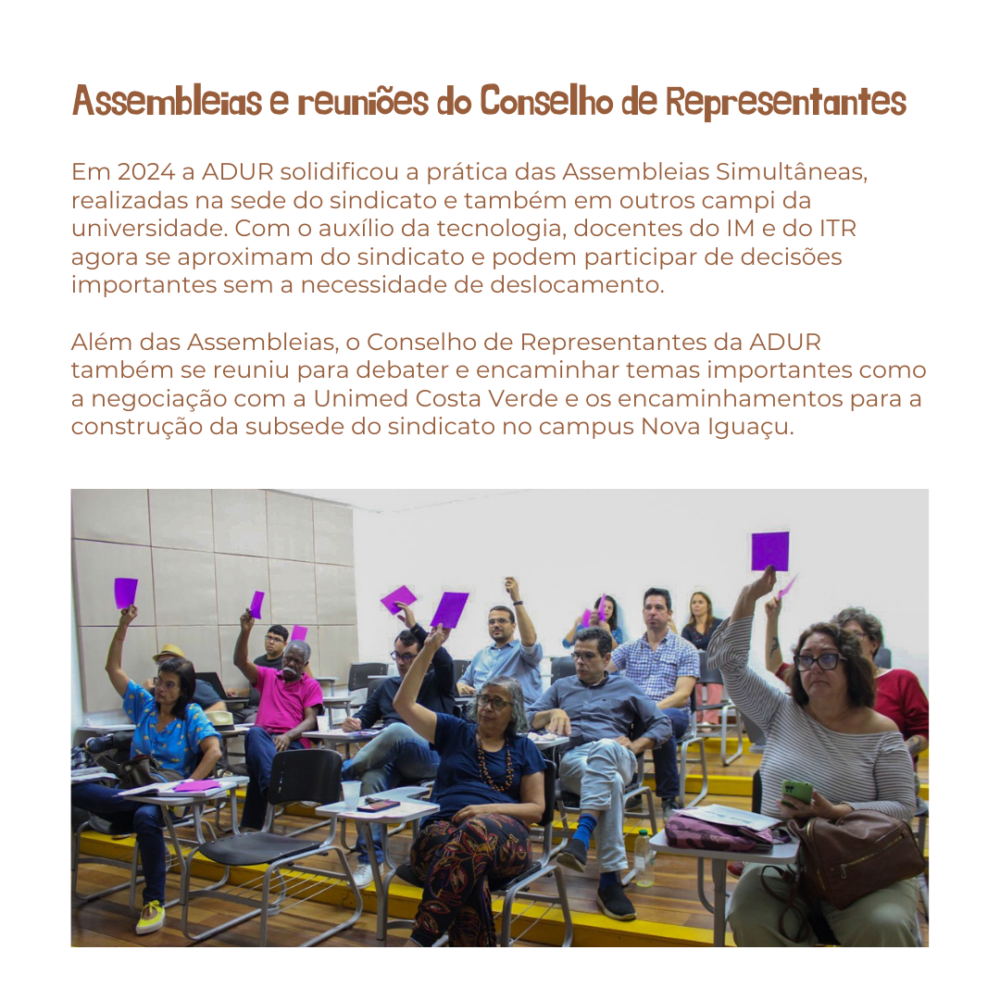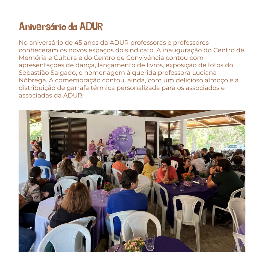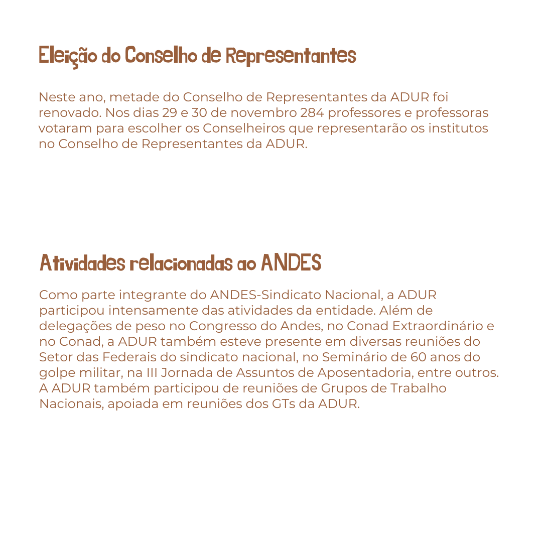 Confira as principais atividades do sindicato no primeiro ano da gestão “ADUR somos nós”. A versão impressa da Retrospectiva 2024 está disponível na sede.
