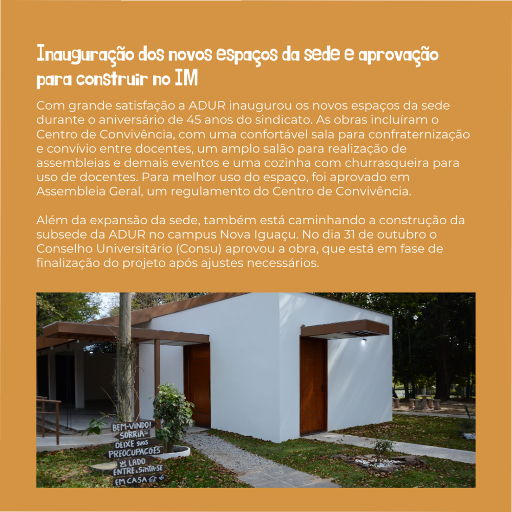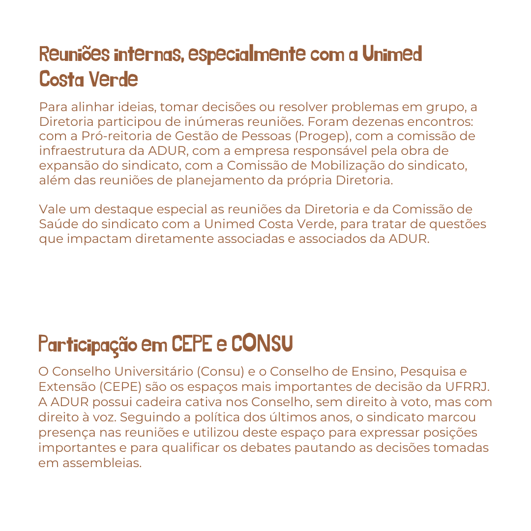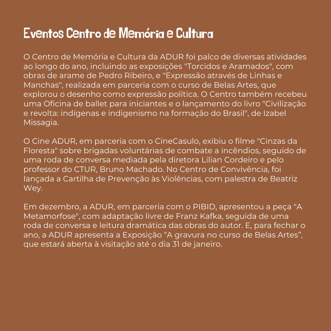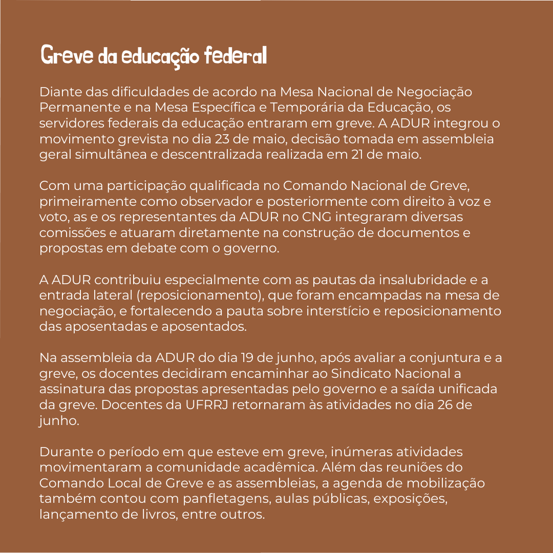 Confira as principais atividades do sindicato no primeiro ano da gestão “ADUR somos nós”. A versão impressa da Retrospectiva 2024 está disponível na sede.