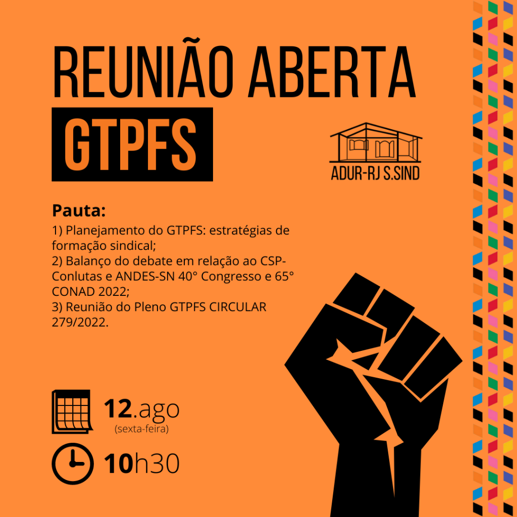No dia 12 de agosto, sexta-feira, às 10h30, acontecerá uma reunião aberta do Grupo de Trabalho em Política e Formação Sindical (GTPFS) da ADUR.