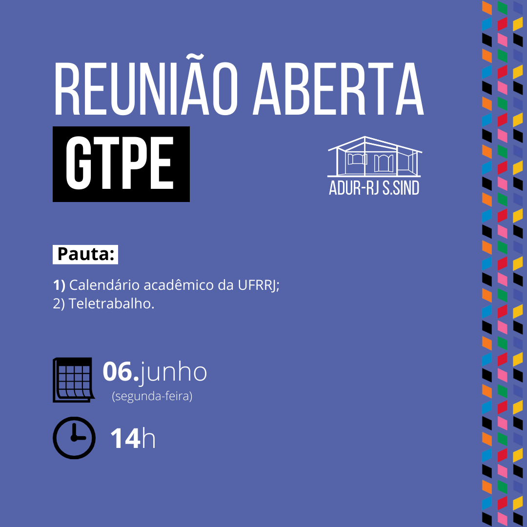 📢 ATENÇÃO, DOCENTES! 📢 📆 Na próxima segunda-feira, dia 6 de junho, às 14h, acontecerá uma reunião aberta do Grupo de Trabalho da ADUR-RJ sobre Política Educacional (GTPE). 📝 A pauta será: 1) Calendário acadêmico da UFRRJ; 2) Teletrabalho. 📲💻 O encontro será transmitido pela plataforma Google Meet e aberto para a participação de todos os docentes. Clique AQUI para acessar. Participe!