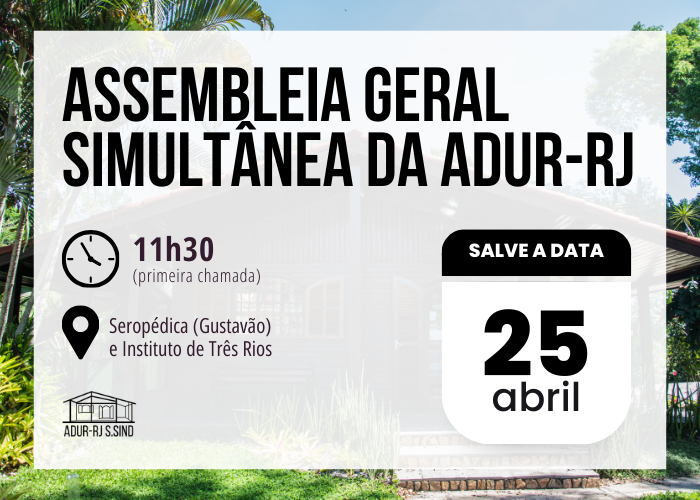 Salve a data!ADUR19 de abr. de 20241 min de leitura25 de abril acontecerá mais uma Assembleia Geral Simultânea da ADURterceira chamada às 12h30. Participe da assembleia! Terá lanche.