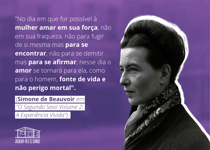 No dia 9 de janeiro de 1908 nascia - o que é considerado por muitos - um ícone do feminismo e uma das principais representantes do movimento existencialista francês do século XX, a filósofa Simone Lucie-Ernestine Marie Bertrand de Beauvoir, ou simplesmente , Simone de Beauvoir. Ao lado do filósofo Jean-Paul Sartre (1905-1980), a intelectual francesa identificou uma multiplicidade de instrumentos e mecanismos que construíram e “naturalizaram” grande diferenciação e hierarquização entre homens e mulheres, sempre em prejuízo dessas últimas. A filósofa, compreendendo a extensão dessa desigualdade e os inúmeros problemas, desenvolveu estudos e argumentos que deram conta de novos saberes que produzissem novas configurações sociais. Símbolo do movimento feminista, Simone de Beauvoir rejeitou o tradicionalismo da formação e da moral religiosa dentro da qual foi educada abordando temáticas inéditas, tanto em âmbito social quanto acadêmico. A sua célebre obra “O Segundo Sexo” (1949), traçou uma profunda análise sobre o papel designado à mulher dentro da sociedade e sobre a construção do que é ser mulher, estabelecendo uma importante distinção entre os conceitos de gênero e sexo. Beauvoir analisou e criticou a hierarquização social do gênero masculino sobre o feminino partir da abordagem onde a humanidade é masculina e o homem define a mulher não em si, mas relativamente a ele, tornando-a, assim, um ser condicionado. Na vasta produção de Beauvoir destacam-se obras que abordam assuntos variados, relacionados ao existencialismo, política, relacionamentos entre homens e mulheres, mães e filhas, à velhice, privilégios e à morte, entre outros. Para a Diretoria da ADUR-RJ, é importante frisar que mesmo depois do seu falecimento, que ocorreu há trinta e seis anos, "o ideal e o movimento emancipatório de Simone de Beauvoir continua vivo e muito atual na construção da luta feminista contra o governo machista e preconceituoso de Jair Bolsonaro".Simone de Beauvoir, Presente!