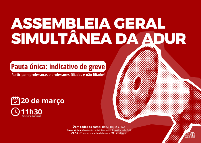 Atenção, docentes!Assembleia Geral Simultânea da ADUR12h30hindicativo de greveSeropédicaNova Iguaçucentro do RioTrês Rio👥 participam desta assembleia docentes filiados e não filiados à ADUR
