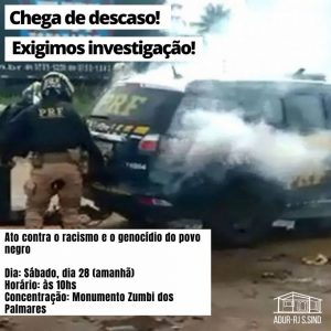 27 de maio de 2022 Imprensa da ADUR-RJ A violência policial parece não ter fim na gestão marcada pelo terrorismo do atual mandatário do país. Depois da chacina na Vila Cruzeiro, zona norte do RJ, agora foi a vez do assassinato de Genivaldo de Jesus Santos após ser trancado no porta-malas de uma viatura da Polícia Rodoviária Federal (PRF) e aspirar um gás lançado pelos policiais, em Umbaúba, no sul do Estado de Sergipe. Essa ação é mais uma revelação da política genocida incorporada na segurança pública sob o comando do Presidente da República Jair Bolsonaro. "É repugnante a posição de um chefe de estado que ao invés de estar preocupado em proteger a população, valoriza e apoia ações que aterrorizam a população mais carente. E mais, esta postura nos remetem a época do fascismo onde Hitler e Mussolini faziam o mesmo com o cidadão comum. Diante destes fatos tenebrosos praticados pela Polícia Rodoviária Federal que tiveram o aval da política genocida do chefe do Executivo, a ADUR-RJ vem a público denunciar a versão preliminar de uma espécie de raio-x das medidas tomadas pelo governo Bolsonaro para lidar com violações de direitos humanos onda não menciona violência policial, chacinas nem operações que resultam em dezenas de mortes no relatório que precisa ser entregue a ONU em agosto. A entidade sindical que representa os docentes da UFRRJ afirma que nada justifica a sequência de erros que causaram a morte do cidadão em Umbaúba/SE e das vítimas da Vila Cruzeiro. Por isso exigimos, além da solidariedade aos familiares das vítima, justiça e aguardamos a posição dos órgãos competentes para punir os culpados sobre as atrocidades ocorridas em Umbaúba (Sergipe) e na Vila Cruzeiro, comunidade localizada na zona norte do RJ. Não vamos recuar. Sábado, dia 28 (amanhã), as 10hs, no movimento Zumbi dos Palmares. Chegou a hora da sociedade dar um basta ao racismo e ao genocida do povo negro!! #PeloFimDasChacinas #VidasNegrasImportam